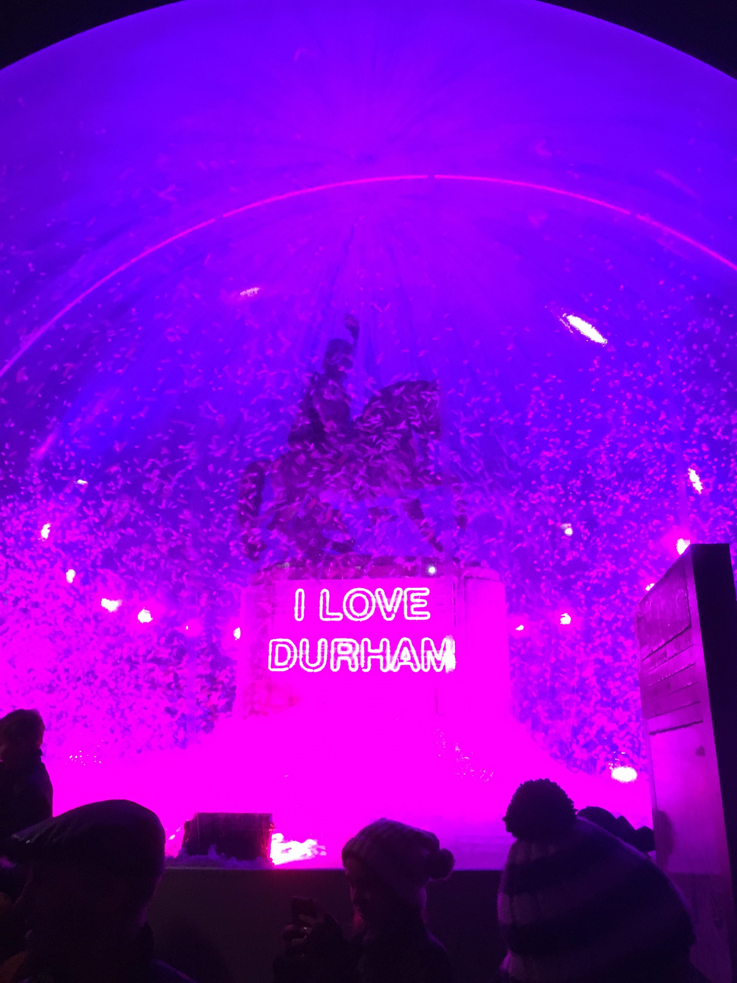 For us the absolute Pièce de Résistance was the ‘I Love Durham’ giant glittering snow globe encapsulating the 3rd Marquess of Londonderry in the marketplace. The Eton-educated MP and Lord Lieutenant of the County was considered a brutal oppressor of the miners he employed in his pits and his statue has been controversial in recent time over whether it should stay or not. However regardless of political discussion, the idea of a Christmas-style snow globe was a delight to see and, in some ways, a fitting pre-Christmas treat.