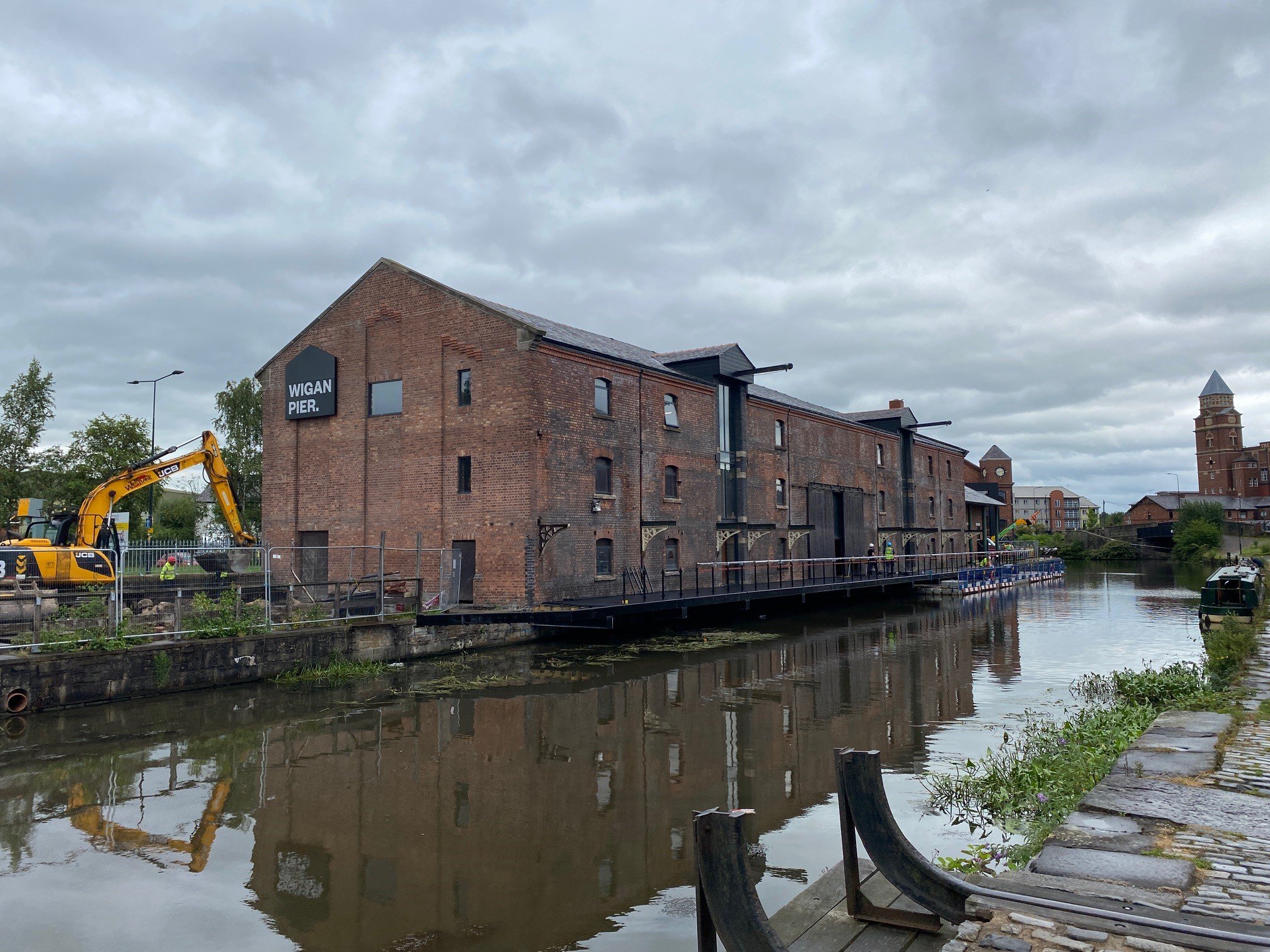 For those of you who have heard of Wigan Pier, but never seen Wigan Pier, this is a picture of ‘The Pier’, it’s the 2 pieces of curved steel sat over the canal, in the bottom righthand side of the picture, yes that is it!  In the background are a series of buildings that we have been involved with in the regeneration of Wigan Pier. The brick and stone warehouse buildings were formerly a visitor centre, teaching space and The Orwell Public House, which have each been refurbished, renovated and re-purposed to form Pier 2-education centre, Pier 3-wedding venue and large events space, Pier 4-micro-brewery and gin distillery and Pier 5-an indoor food market and venue.  New windows and cladding, with works to the roof which were desperately needed to make the building watertight and to keep the pigeons out.  A new feature entrance to Pier 3 gives a pleasant back drop to all the visitors and wedding party guests visiting the Pier buildings.  New landscaping and public realm works will link the newly fitted board walks, which will provide private amenity space to each part of the venue space, which looks out over the canal.  The internal fitout work will start shortly and the external works are well advanced, due for completion in the coming months, an achievement during COVID-19.