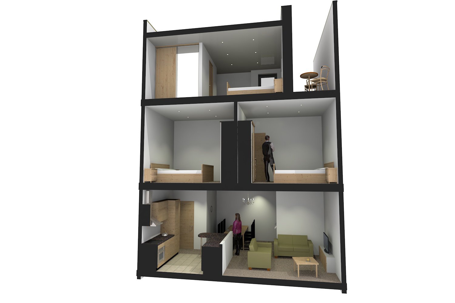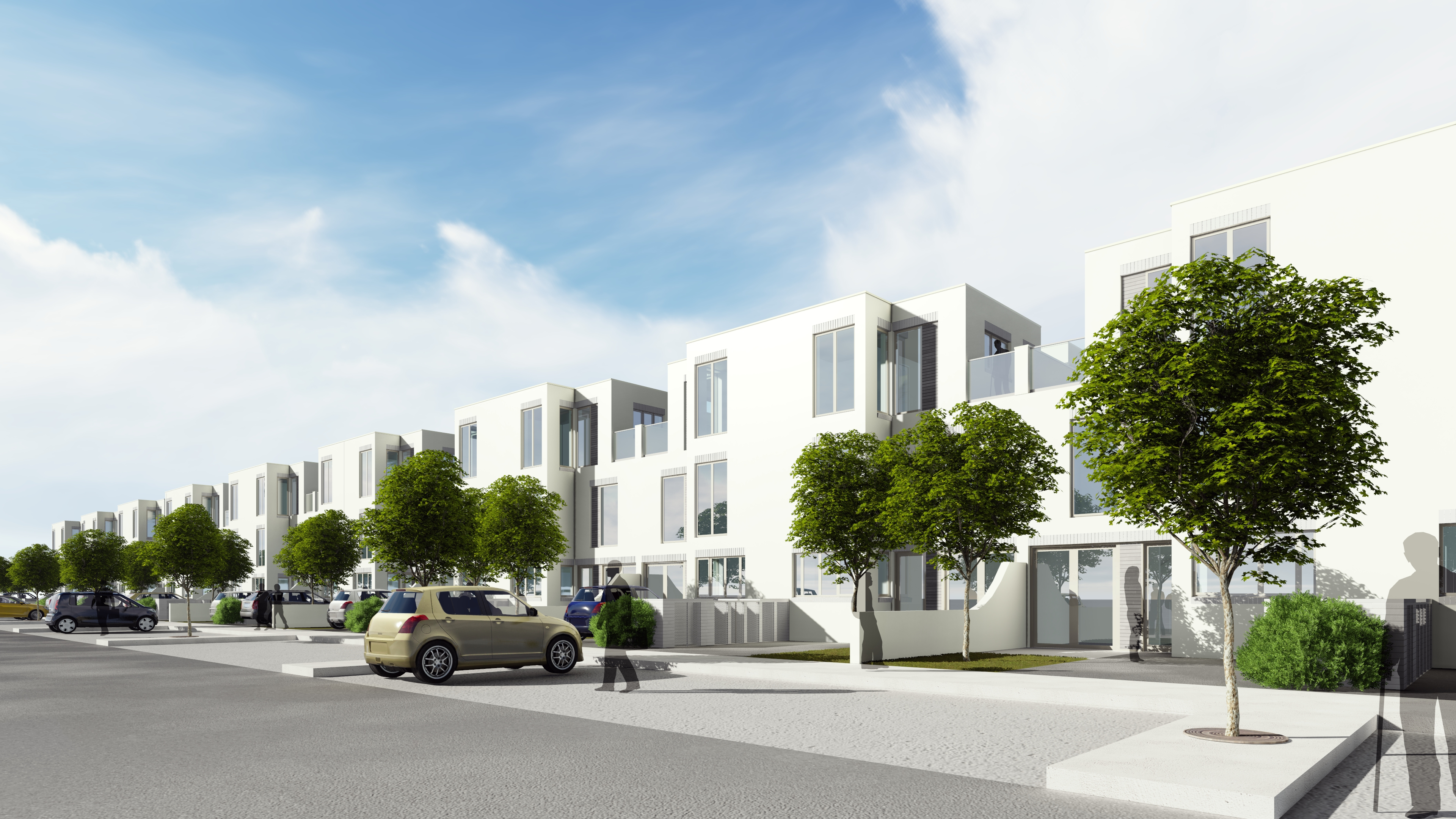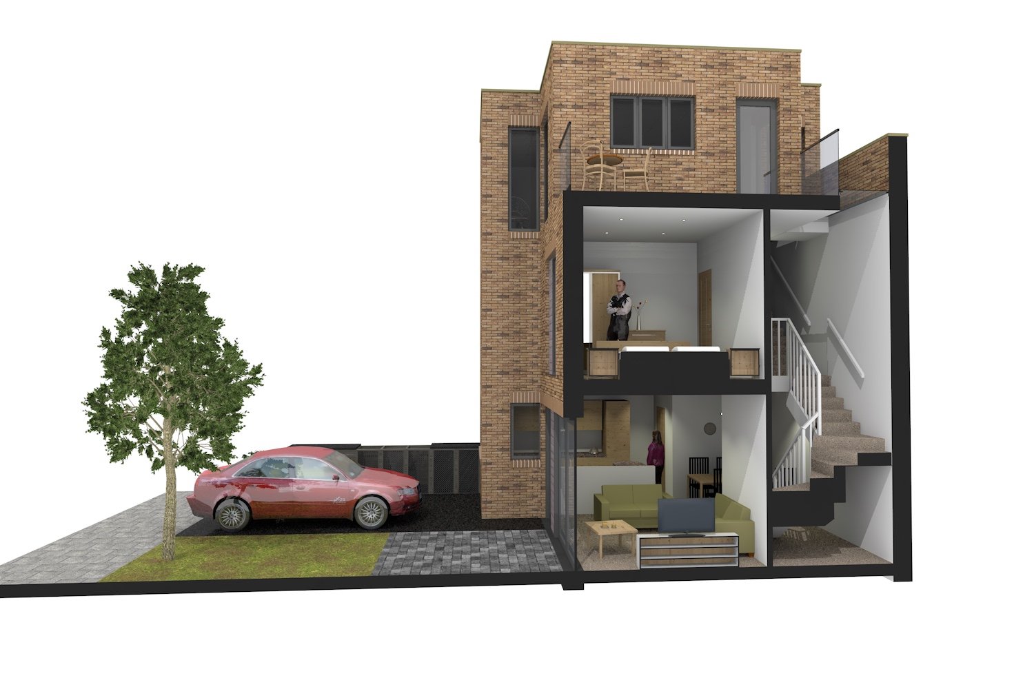 Dense and resource efficient, back-to-back housing has the potential to provide up to 70 plus dwellings per hectare in urban situations. The individual housing unit is a magical 1002 sqft unit over three levels and maximises width of property over depth, placing stairs at the rear of the property, top lite. The use of a second floor terrace provides a gin and tonic space without having to descend, with a view across the street or landscape depending on orientation. The frontage allows for off road parking, compact gardens, external storage space and meter housings.