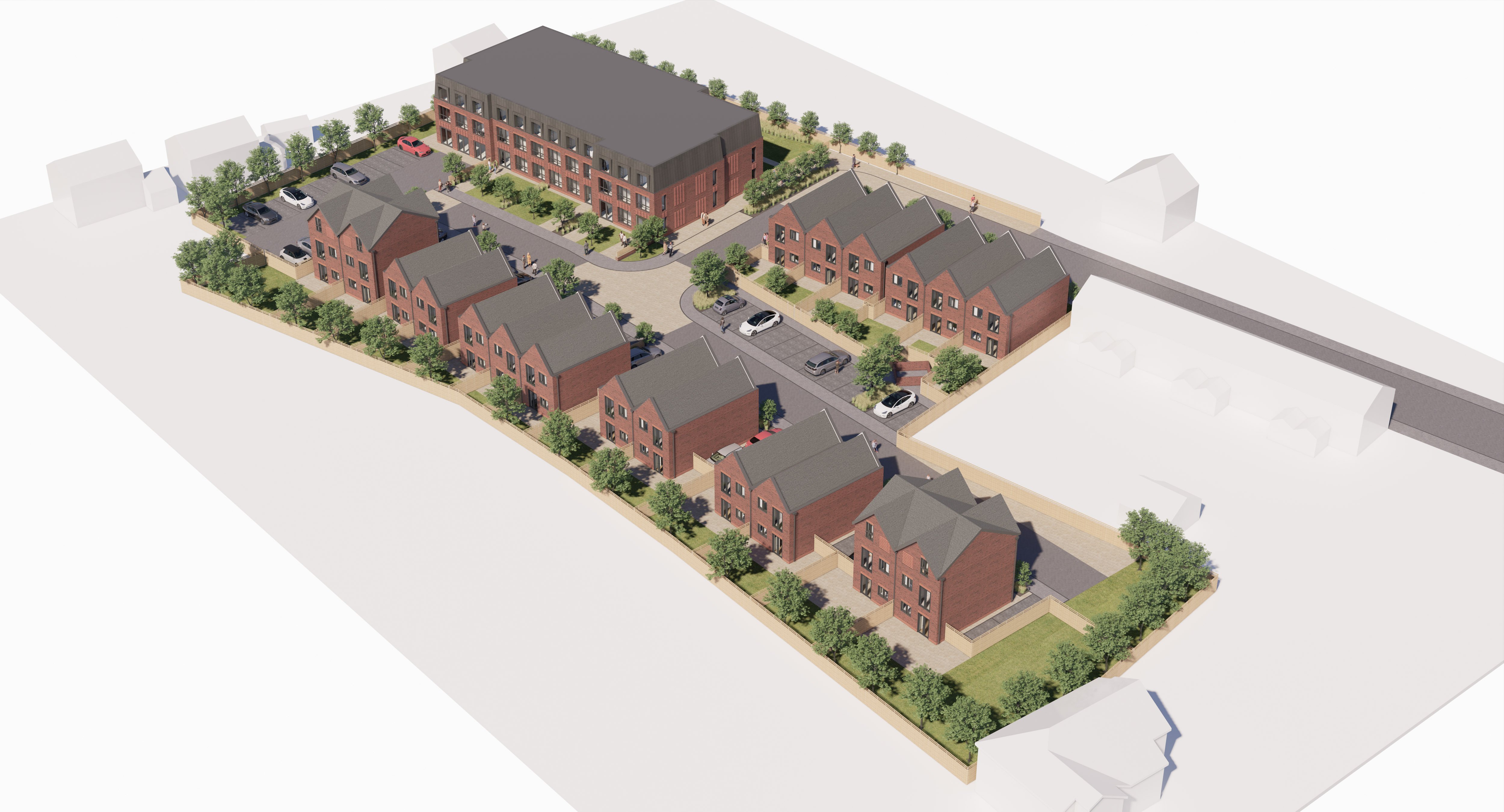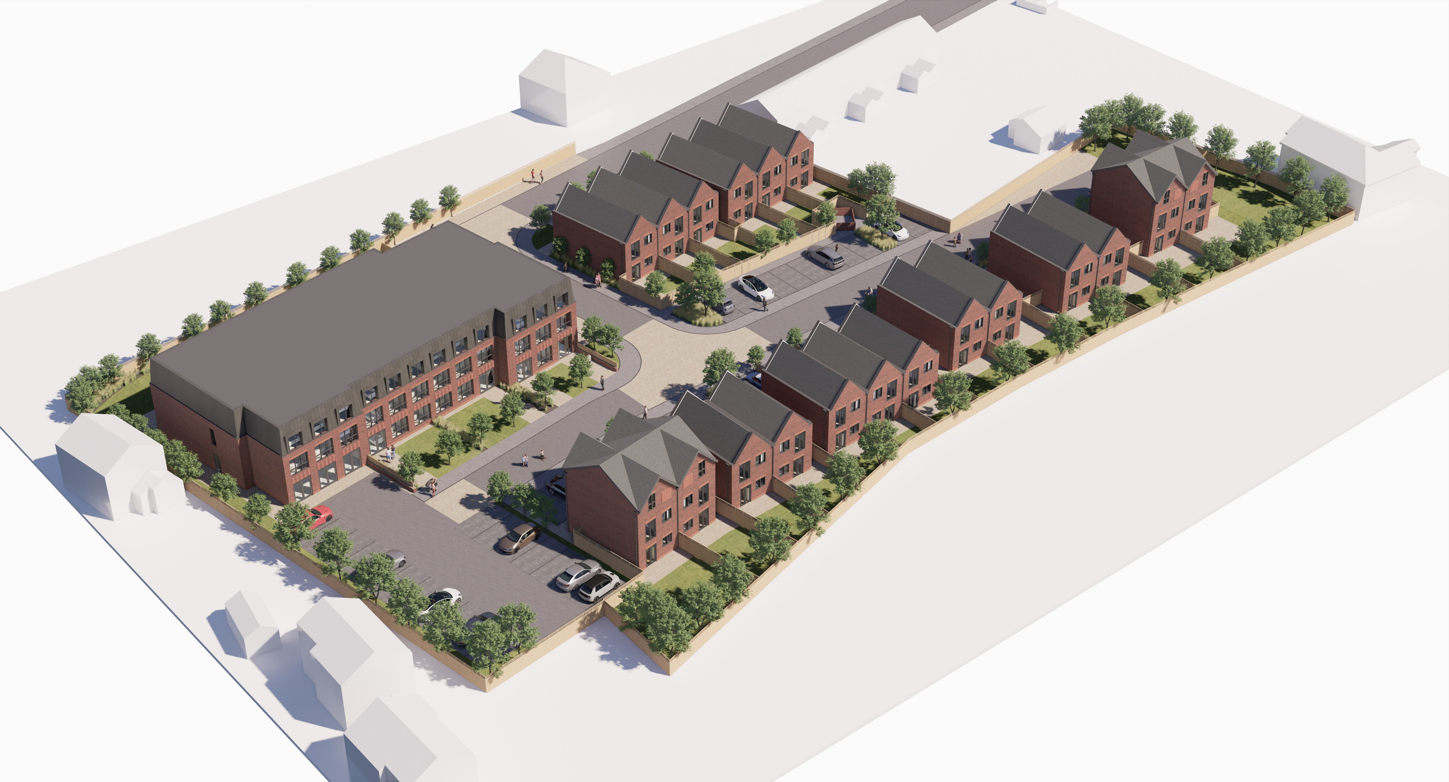 A mix of 2, 3 and 4 bed houses, 2 and 3 storey houses and a 26-unit apartment, with a mix of 1 and 2 bed units, with private parking and garden space. The design was developed by looking at several building as inspiration for the new houses and apartment scheme. We have chosen a pallet of materials which work across the whole site, with the same brick type and above door and window soldier course, brick banding to the base and feature brick zones. Large format repeating grey windows and doors have been proposed for the site, with grey tiles to the pitched roof houses and metal cladding to the mansard roof, with feature hoods. The chosen materials are low maintenance and cost effective, with the detail providing the quality feel for the proposed site.