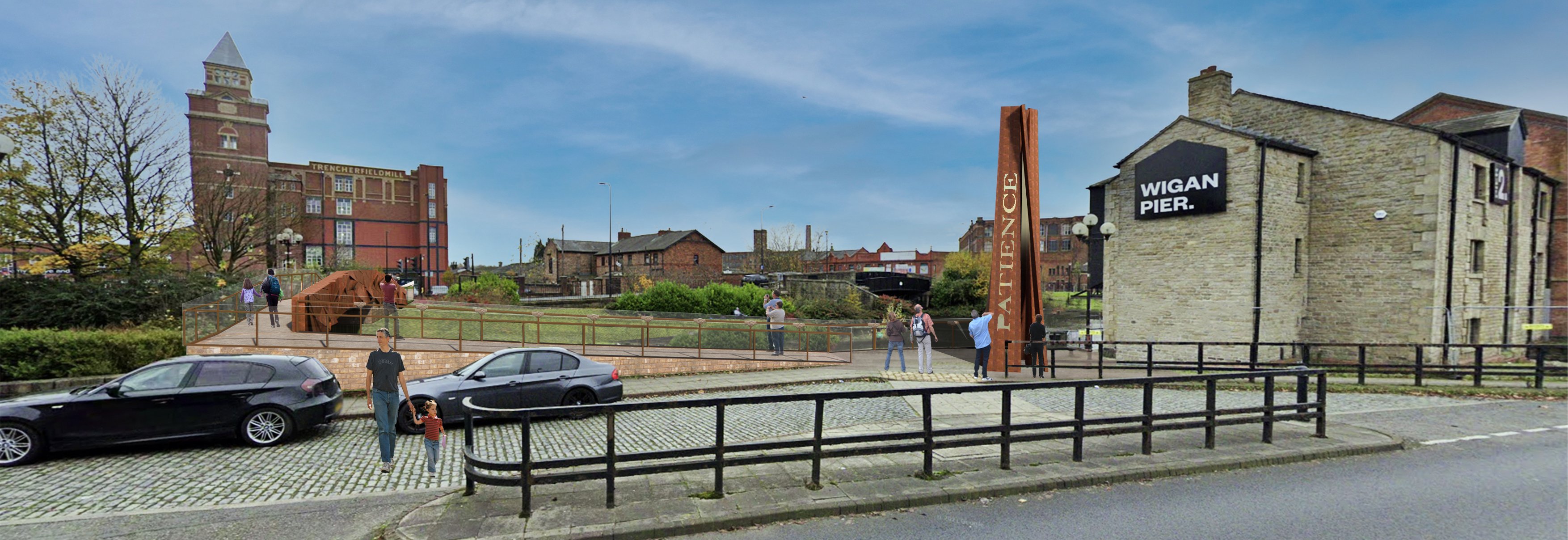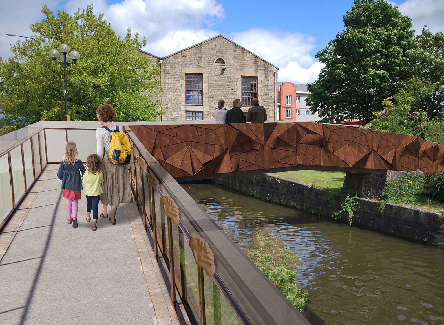 Handrails guide and support our journey over a bridge; therefore helping each other, cross over to the other side in a simple expression of human kindness. Members of the local community who have lost loved ones or who are Key Workers invited to make casts of their hands extending across the bridge in a continuous rail of helping hands.