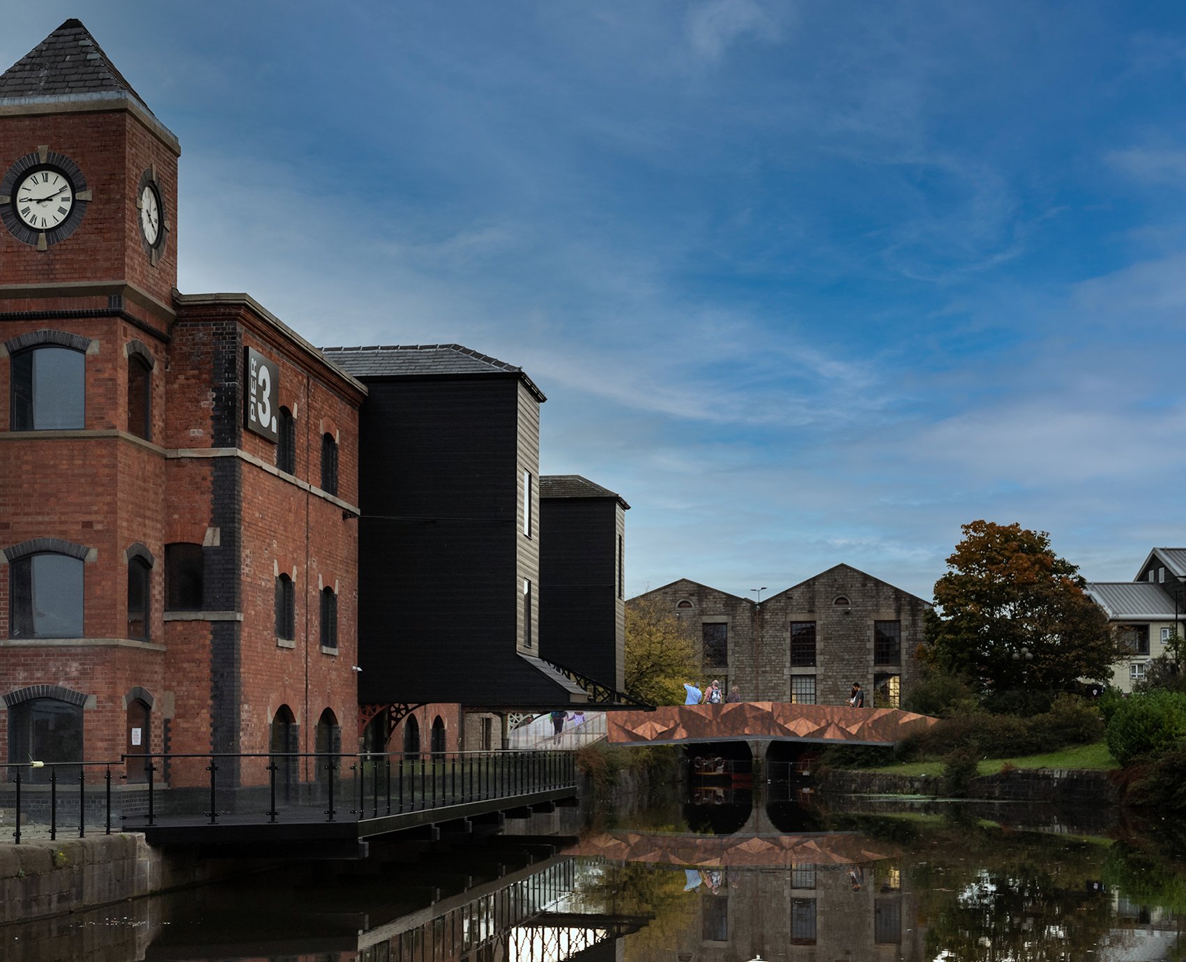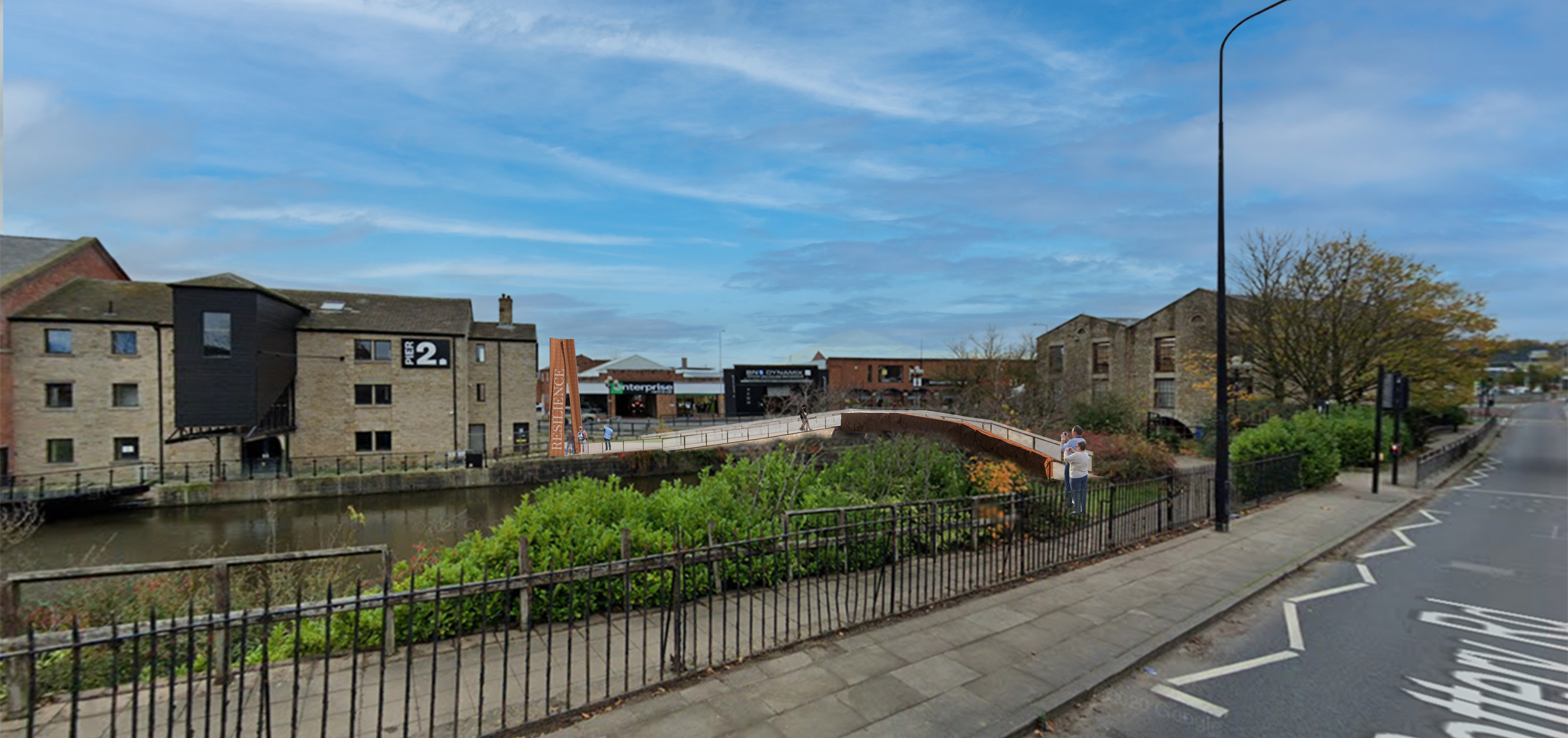 One side of the bridge has the hand rail, the other side of the bridge has metal folded shapes like face masks to remind us all of the united effort in stopping the spread of the virus.